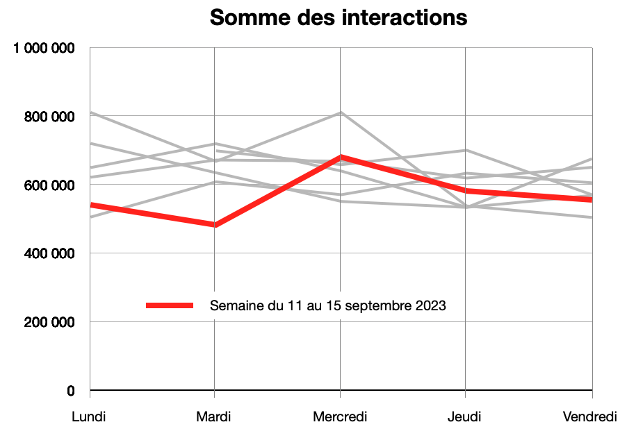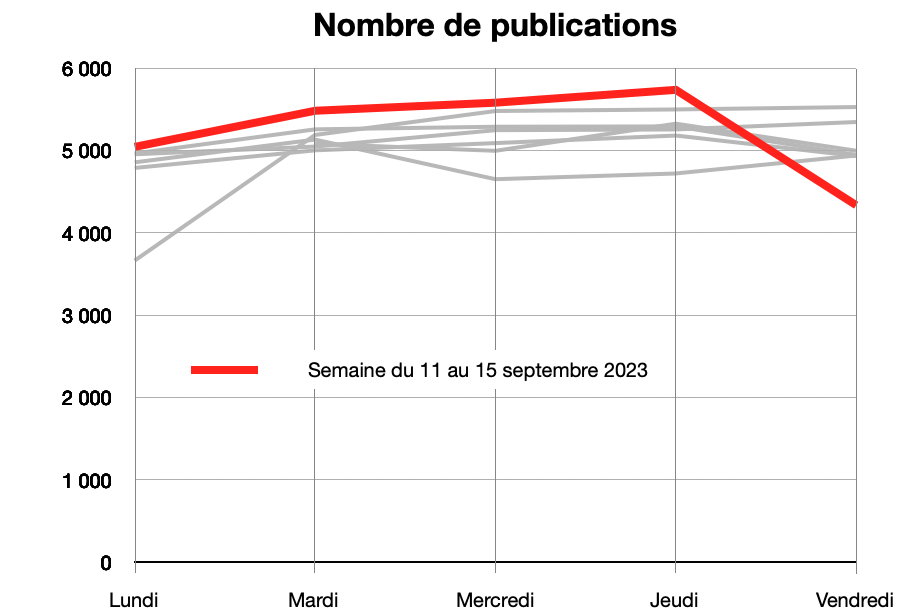 Le graphique du nombre de publications montre que la semaine du 11 septembre a été particulièrement active, par rapport aux semaines précédentes, jusqu’au vendredi où le nombre de publications a chuté de manière significative.