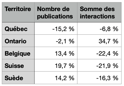 Quand on compare l’activité Facebook au Québec francophone à d’autres régions comparables (Ontario, Belgique, Suisse et Suède), le bilan apparaît cependant plus mitigé.